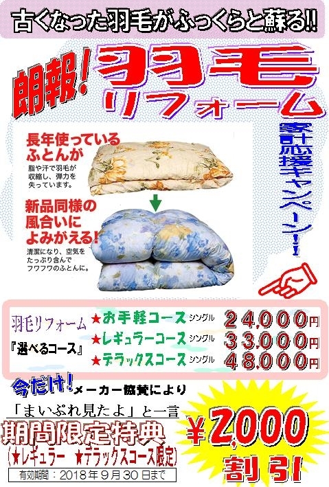 おふとんを新調される場合は、買い替え下取りセール実施中! お買い上げ金額の10%で古いふとんを引き取ります(*下取り最高5,000円まで)。詳しくは、お問い合わせ下さい。